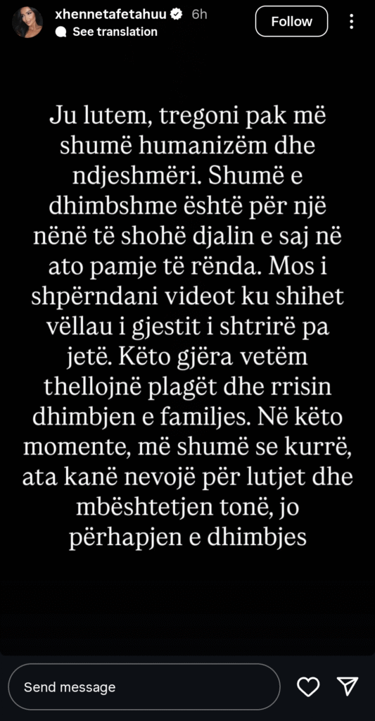Në një story tjetër, ajo ka bërë thirrje dhe kërkesë publike që mediat mos t’i publikojnë pamjet nga ngjarja dhe të tregojnë më mëshirë ndaj familjarëve të vet. Kërkesë mjaftë e drejtë.