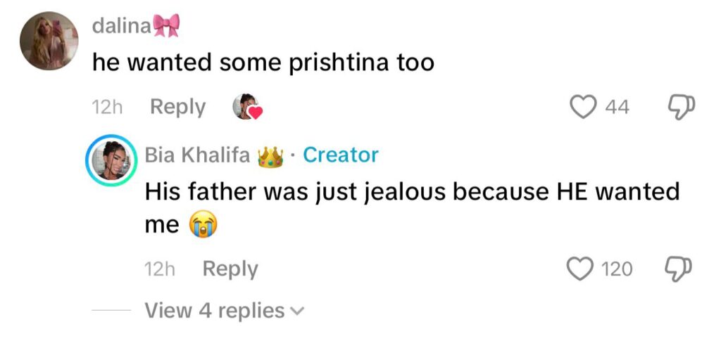 Përveç videos, vëmendje të madhe ka marrë edhe një koment i Bias në po të njëjtin postim. Duke iu përgjigjur një ndjekësi që shkroi se babai i Toney-t “donte pak Prishtinë gjithashtu”, Bia u përgjigj me tone mjaft ironike: “Babai i tij ishte thjesht xheloz sepse ai më donte mua”. Me këtë deklaratë, Bia ndezi rrjetin duke lënë kokludime te ndjekësit se arsyeja e vërtetë pse ai kërkoi që Toney të qëndronte larg saj nuk ishte mosmiratimi prindëror, por një pëlqim personal i fshehu