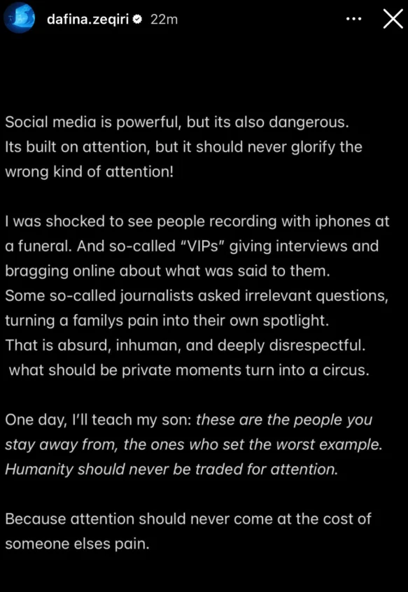 Më pas, Dafina shpërtheu edhe ndaj “VIP”-ave, ku tha: “U trondita kur pashë njerëz që filmonin me telefona në një varrim. Ndërkohë disa të ashtuquajtur “VIP” jepnin intervista e mburreshin online me fjalët që u ishin thënë. Madje edhe disa gazetarë bënin pyetje të parëndësishme, duke e kthyer dhimbjen e një familjeje në dritën e reflektorit për interesin e tyre. Kjo është absurde, çnjerëzore dhe thellësisht mosrespektuese. Çfarë duhet të ishin momente private, u shndërruan në një shfaqje”.