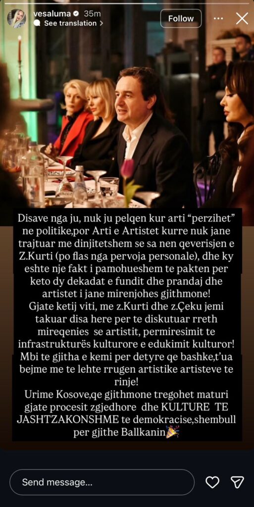 “Disave nga ju nuk ju pëlqen kur arti ‘përzihet’ në politikë, por arti dhe artistët kurrë nuk janë trajtuar më dinjitetshëm sesa nën qeverisjen e z. Kurti,” ka shkruar këngëtarja, duke e cilësuar këtë si një fakt të pamohueshëm të dy dekadave të fundit.