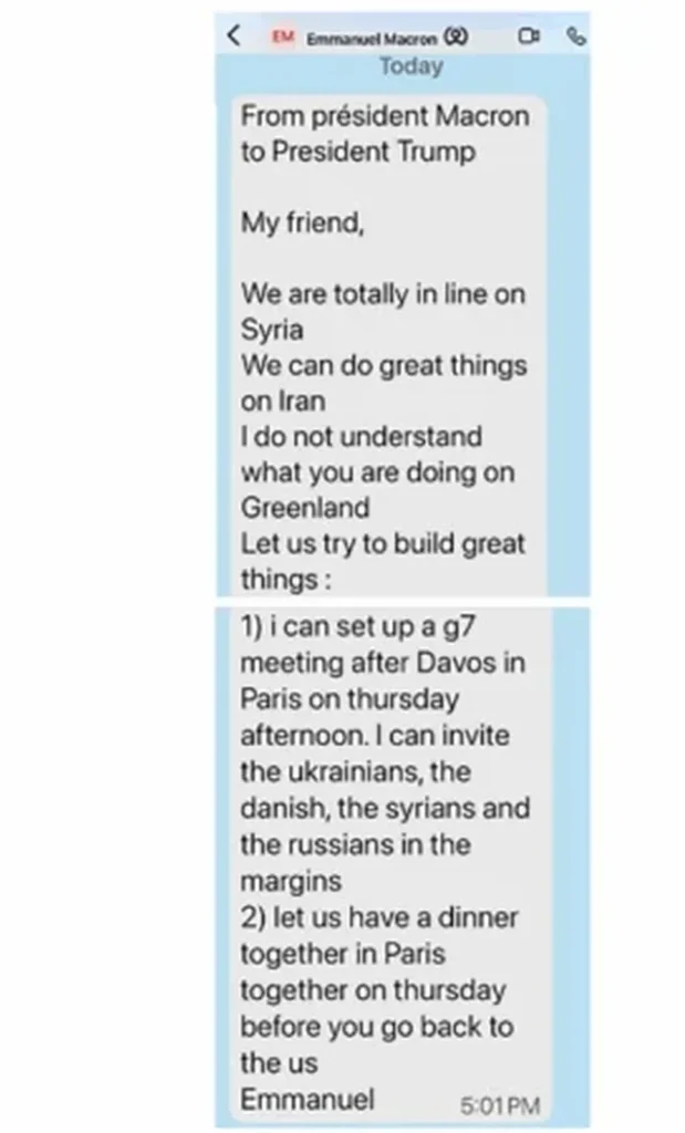Krahas mbishkrimit “Shënim nga Presidenti Emmanuel Macron i Francës”, në mesazhin e publikuar thuhet: “Miku im, jemi plotësisht dakord për Sirinë. Mund të bëjmë gjëra të mëdha për Iranin. Nuk e kuptoj çfarë po bën me Groenlandën.”