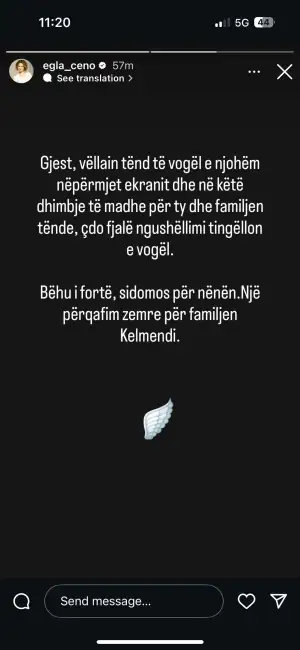 Në një mesazh të ndarë dhe emocionues në rrjetet sociale, Egla Ceno i drejtohet Gjestit dhe familjes së tij me fjalë të ngrohta dhe ngushëlluese.