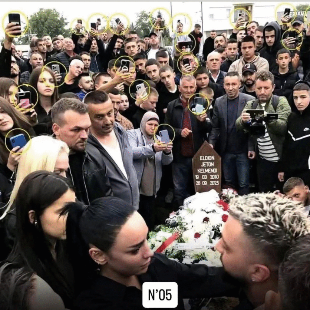 Në një fotografi të publikuar nga ceremonia, shihet qartë se dhjetëra persona, në vend që të respektonin privatësinë dhe dhimbjen e familjes, mbanin celularët e tyre në duar duke filmuar apo fotografuar këtë moment.