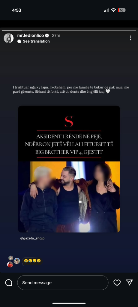 “I trishtuar nga ky lajm i kobshëm, për një familje të bukur që vetëm pak muaj më parë festonte gëzime. Bëhuni të fortë, sepse këtë do të donte edhe engjëlli juaj”, ka shkruar Ledion Liço në Instastory.