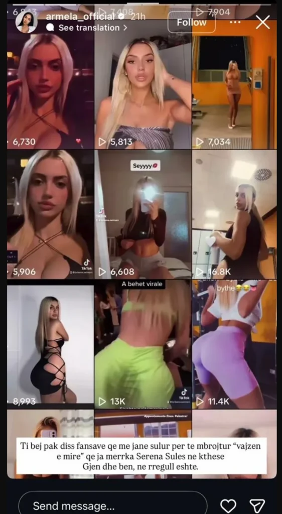 “T’i bëj pak diss fansave që më janë sulur për të mbrojtur ‘vajzën e mirë’ që ia merrka Serena Sulës në kthesë. Gjen dhe bën, në rregull është,” ka shkruar Armela në Instastory, duke lënë të kuptohet se imazhi i “vajzës së mirë” që Brikena po shfaq, është thjesht një fasadë.