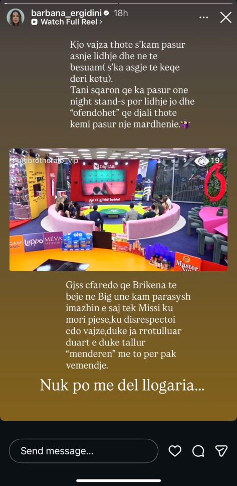 Në llogarinë e saj në Instagram, Barbana ka bërë një reagim të ashpër në lidhje me rrëfimin e Brikenës për jetën e saj sentimentale.