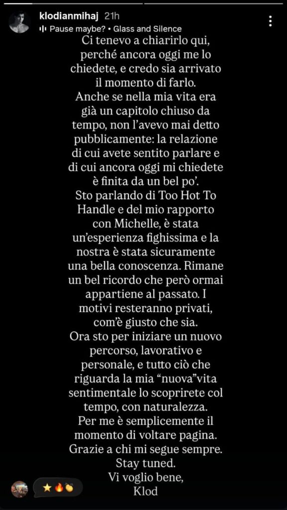 Pak para se të shkelte pragun e shtëpisë, ish-konkurrenti i ‘Too Hot To Handle Italia’ publikoi një njoftim të detajuar në rrjetet sociale, duke konfirmuar ndarjen e tij nga partnerja e tij e njohur nga reality show, Michelle.