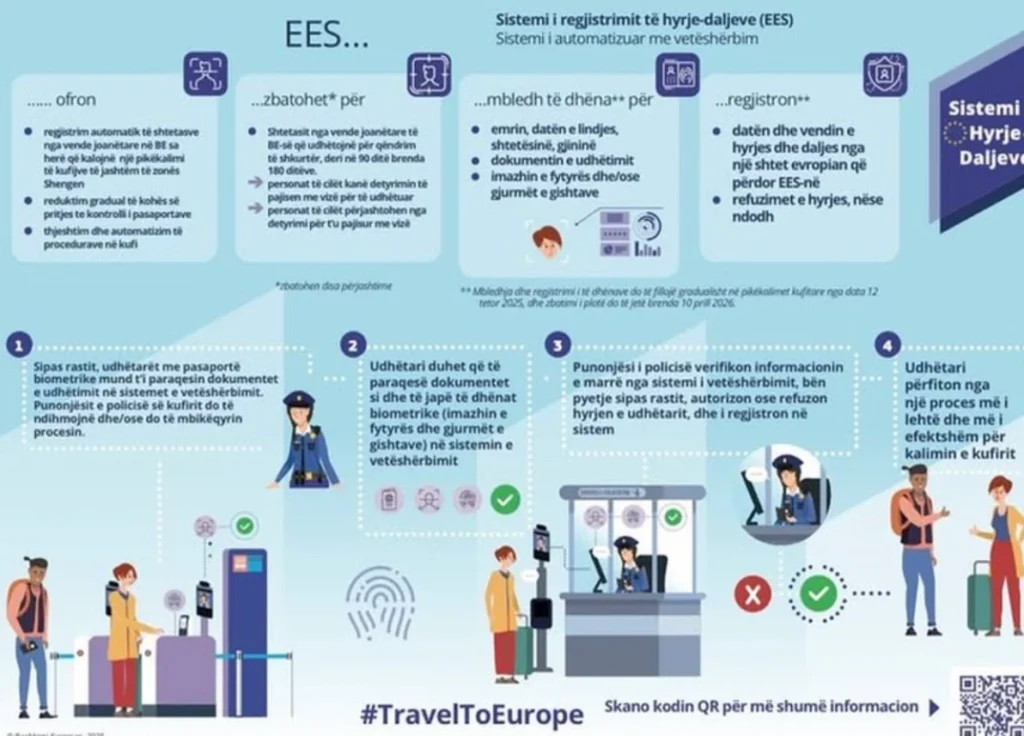 Nga data 12 tetor 2025, një sistem i ri i menaxhimit të kufijve, Sistemi i Hyrje/Daljes (Entry/Exit System), do të fillojë gradualisht të regjistrojë: të dhënat nga dokumenti i udhëtimit, datat e mbërritjes dhe të largimit, të dhënat biometrike (shenjat e gishtave dhe imazhi i fytyrës)
