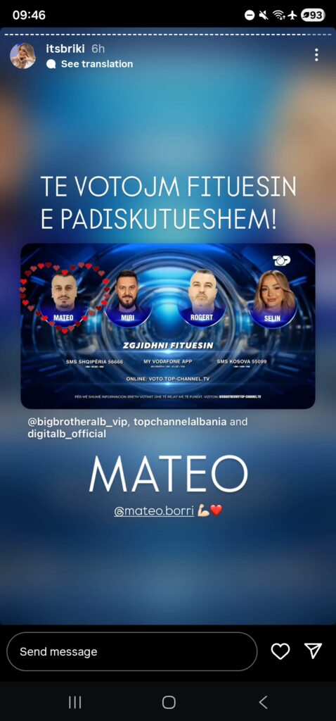 Mbështetja e saj nuk ka vonuar asnjë sekondë sapo mori telefonin në dorë. Që prej orës 4 të mëngjesit, i vetmi postim origjinal në Story-n e saj në Instagram, përpos një lumi ripostimesh, i dedikohej ekskluzivisht betejës së Mateos për çmimin e madh.