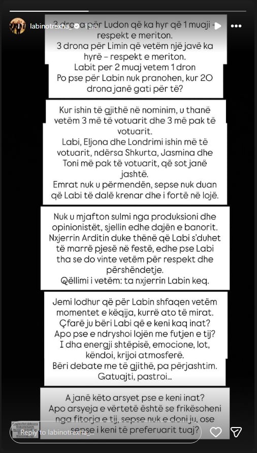 Sipas tyre, Labinoti ka qenë pjesë e shtëpisë për rreth dy muaj, një periudhë e gjatë ku ai ka qenë vazhdimisht aktiv, i përfshirë në debatet kryesore, dinamikat e lojës dhe atmosferën e përgjithshme. Megjithatë, pavarësisht kësaj pranie dhe angazhimi të vazhdueshëm, ai ka marrë vetëm një dron, ndërkohë që banorë të tjerë, të cilët kanë hyrë më vonë ose kanë pasur një qëndrim më të shkurtër, janë favorizuar dukshëm më shumë.