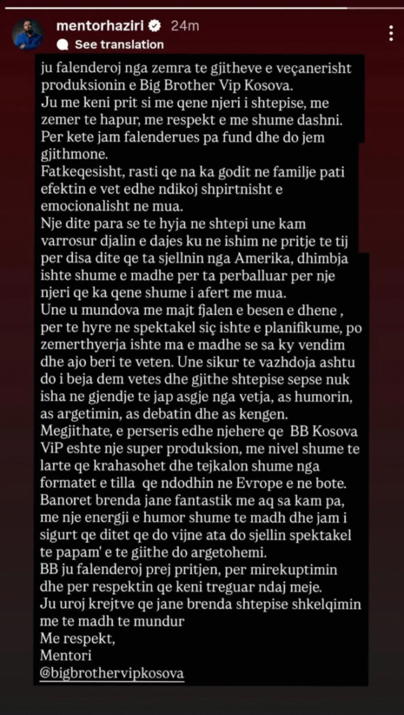 Largimi i papritur i Mentor Hazirit nga shtëpia më e famshme në Kosovë, vetëm pak orë pasi kishte nisur aventura e tij, shkaktoi shumë pikëpyetje dhe diskutime në rrjet. Por mbrëmë, këngëtari vendosi të flasë për herë të parë, duke zbuluar një arsye shumë më të rëndë sesa çdo aludim apo hamendësim.
