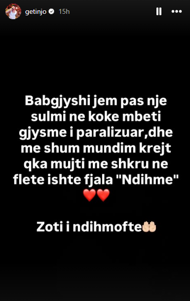 “Babgjyshi jem pas një sulmi në kokë mbeti gjysmë i paralizuar dhe me shumë mundim krejt çka mujt me shkrue në fletë ishte fjala ‘Ndihmë’. Zoti i ndihmoftë,” shkroi ai në një postim në “Instastory”.