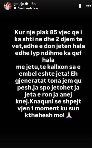“Kur një plak 85 vjeç që i ka shti në dhe 2 djem të vet edhe e don jetën hala edhe lyp ndihmë… të kallxon sa e ëmbël është jeta,” shkroi Getinjo, duke reflektuar mbi forcën dhe vullnetin e të moshuarit.