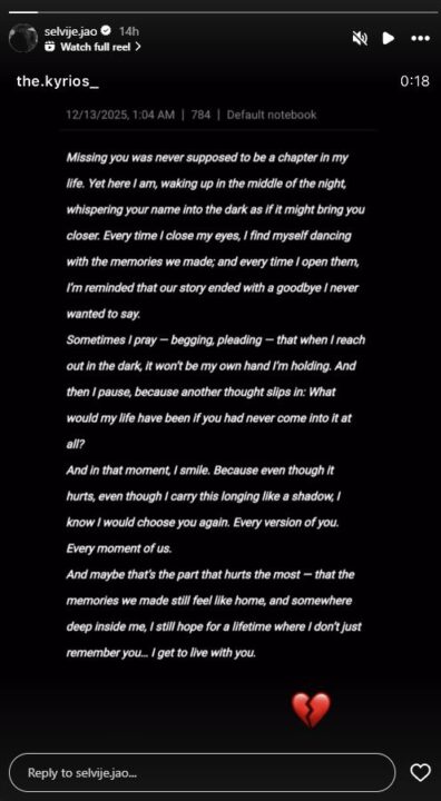 Selvije Jao herë pas here bën postime prekëse në rrjetet sociale, të cilat janë dedikime të ndjera për partnerin e saj, Shpat Kasapi, i cili ndërroi jetë në nëntor të vitit 2025 pas një ataku në zemër.