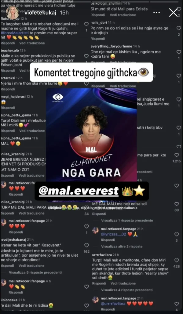 Pas eliminimit të Malit nga “Big Brother VIP Albania”, nëna e tij, këngëtarja Violetë Kukaj, ka reaguar në llogarinë e saj në Instagram.